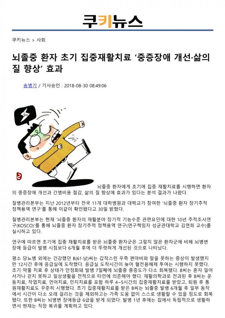 2018 뇌졸중 환자 초기 집중재활치료 ‘중증장애 개선·삶의 질 향상’ 효과 쿠키뉴스 2018.08.30