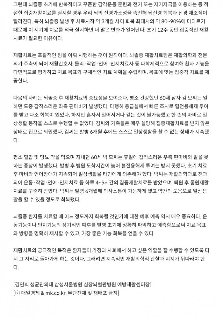 2020 뇌졸중 후 재활, 3개월이 중요한 이유는? 한국일보 2020.11.19